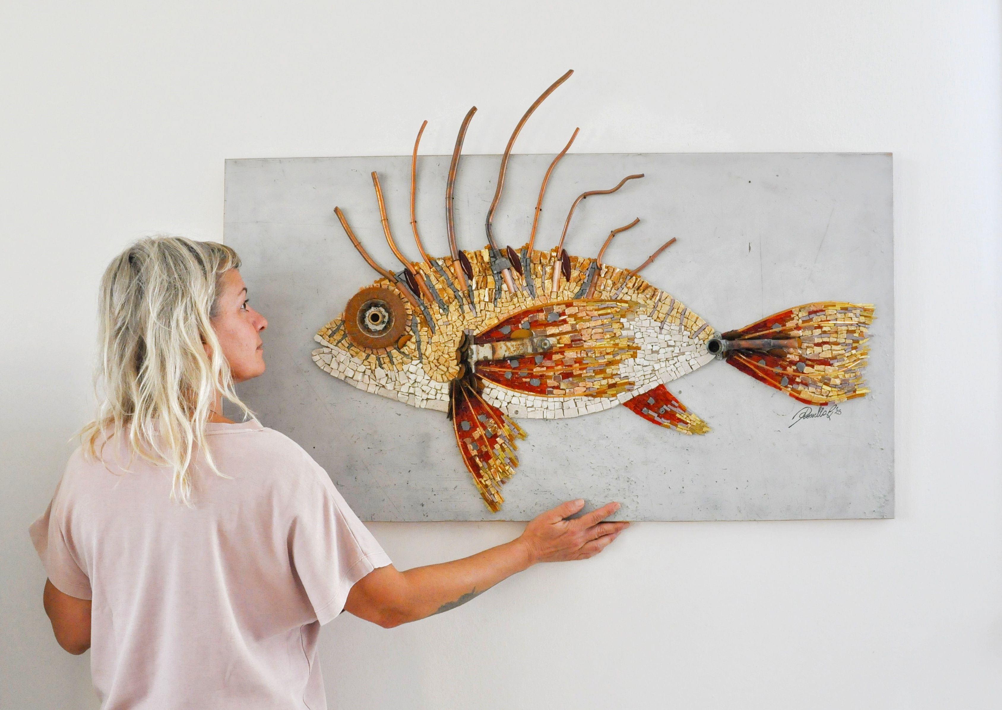 Nel mio studio di Cesenatico prendono vita pezzi unici, frutto di uno stile personale e molto ricercato. Oro e smalti veneziani si fondono con materiali di recupero, come portoni, parti di mobili o attrezzi in ferro, che riprendono vita carichi di memoria. Ogni mosaico racconta la sua storia, trasformando luce, colore e texture in composizioni armoniose e suggestive.