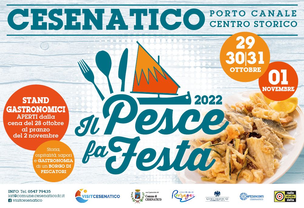 Da venerdì 28 ottobre (cena) a mercoledì 2 novembre 2022 (pranzo) a Cesenatico torna “Il Pesce fa Festa”, il grande appuntamento gastronomico autunnale, organizzato dal Comune di Cesenatico in collaborazione con Confesercenti e Confcommercio, dedicato al protagonista assoluto delle tavole locali: il pesce dell’Adriatico. Il pittoresco centro storico della cittadina romagnola per quattro giorni si trasforma in un grande ristorante a cielo aperto, ma non solo, perché, ad accompagnare il profumo delle squisite grigliate, delle croccanti fritture e degli altri piatti tipici della tradizione, sono previste diverse iniziative che andranno ad integrare e completare il programma della manifestazione, con il fine di promuovere e valorizzare la cultura e l’identità marinara. Il cuore della sagra gastronomica come sempre sarà il porto canale disegnato da Leonardo Da Vinci e il centro cittadino.