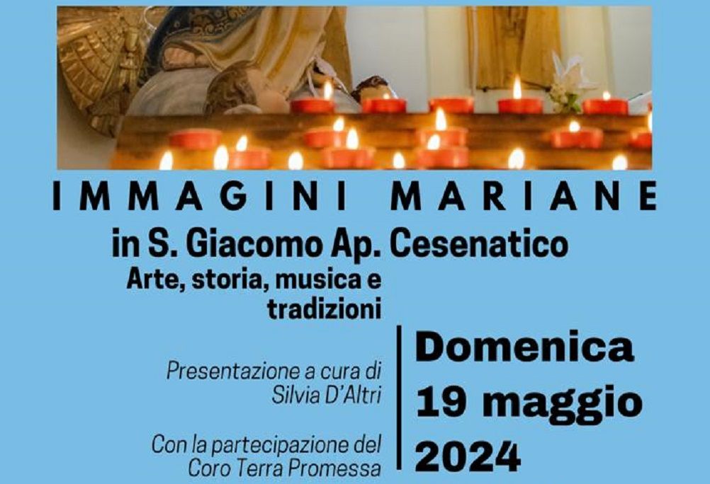 Domenica 19 maggio 2024 ore 20:45 apre in Chiesa San Giacomo Apostolo Cesenatico l’esposizione “Immagini Mariane, arte storia musica e tradizioni” organizzata dal Centro Culturale Il Gabbiano. La presentazione è a cura di Silvia D’Altri con la partecipazione del Coro Terra Promessa. Ingresso gratuito